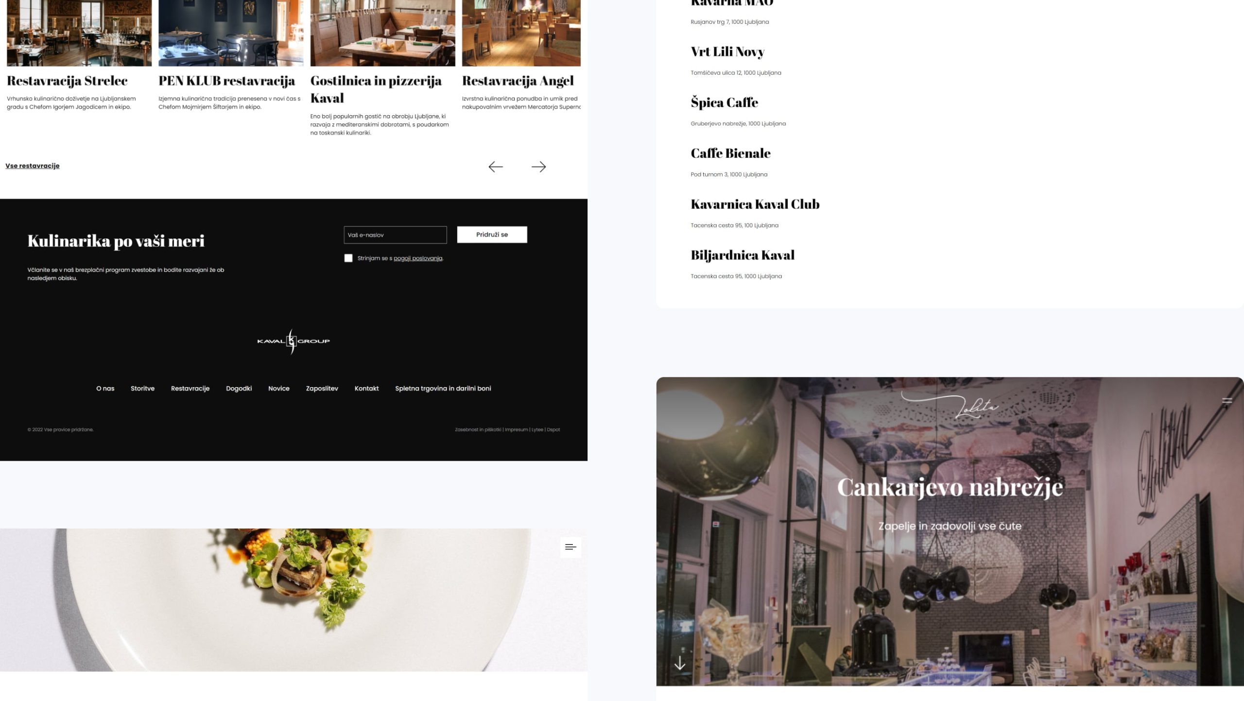 Design se je začel z glavno stranjo Kaval Group, ki zaokrožuje celotno zgodbo –predvideno predstavitev celotne ponudbe sem sestavil kot prikaz vseh restavracij za posamezno storitev, te pa se lahko nato posamično raziskuje naprej.