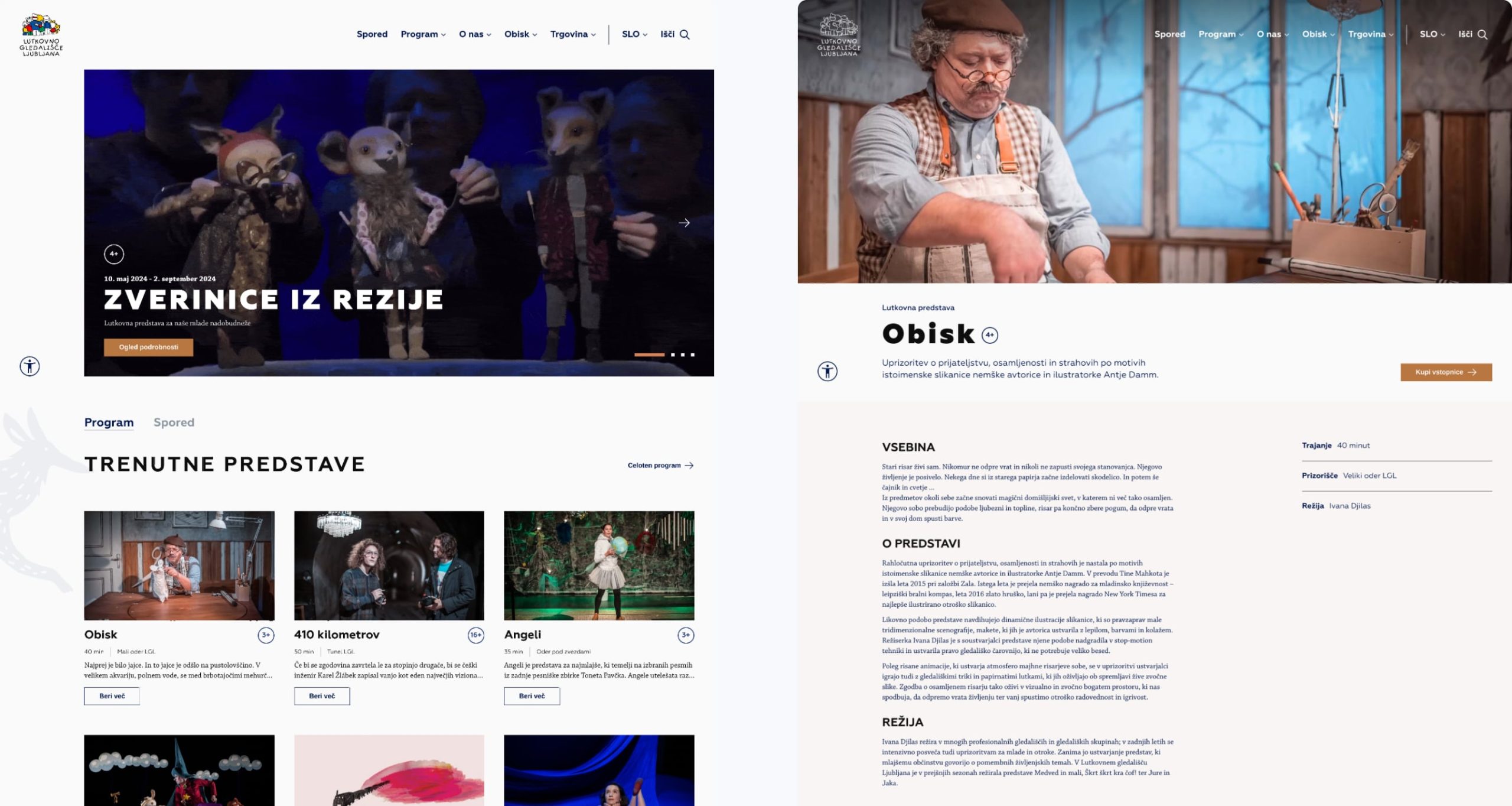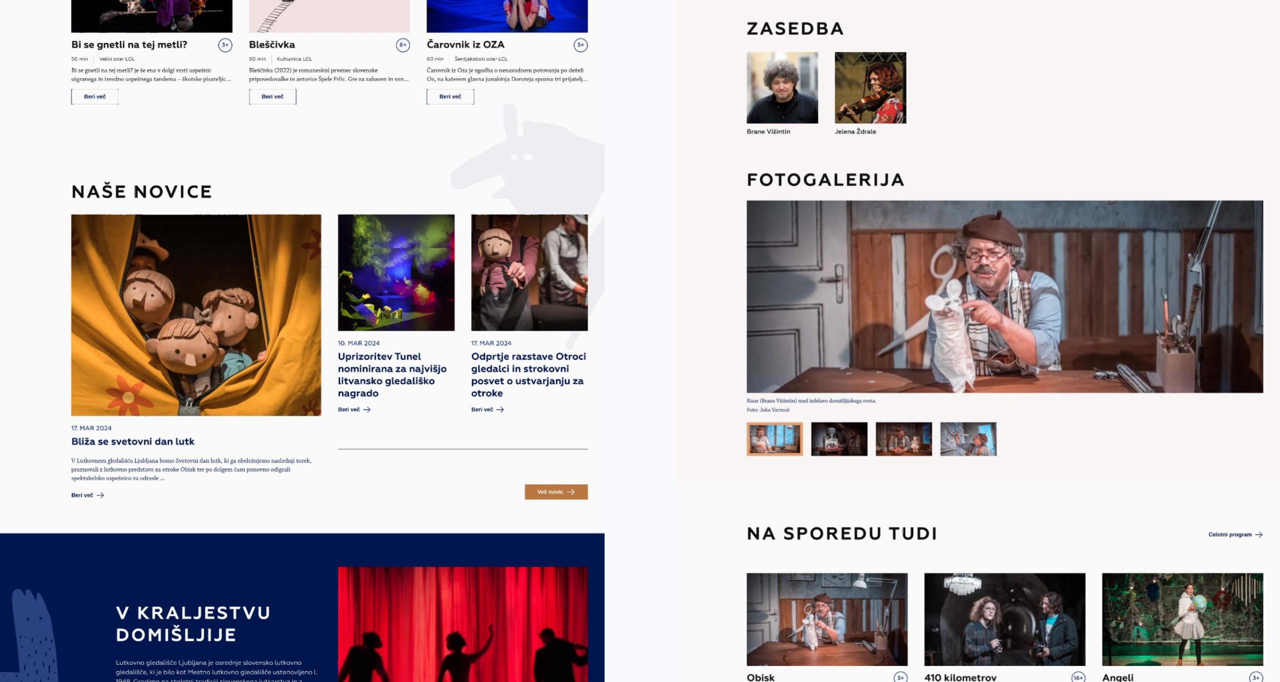 Ker je vsaka predstava vizualno unikatna, sem želel, da stran služi kot “oder”, na katerem pride vsebina do izraza. V ta namen sem uporabil minimalistično barvno paleto in v fokus postavil fotografije in videoposnetke.