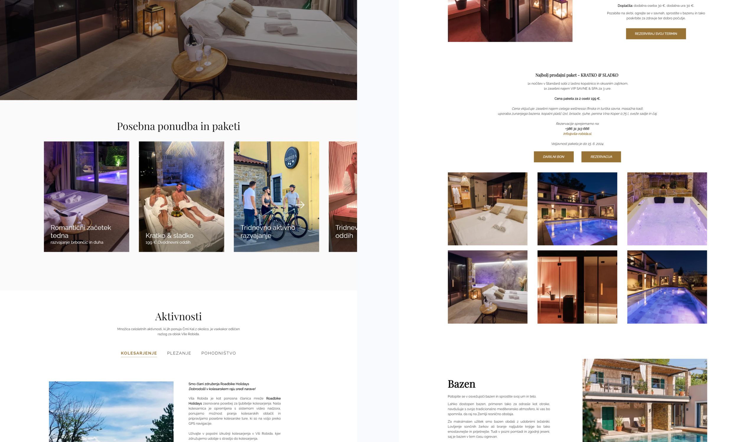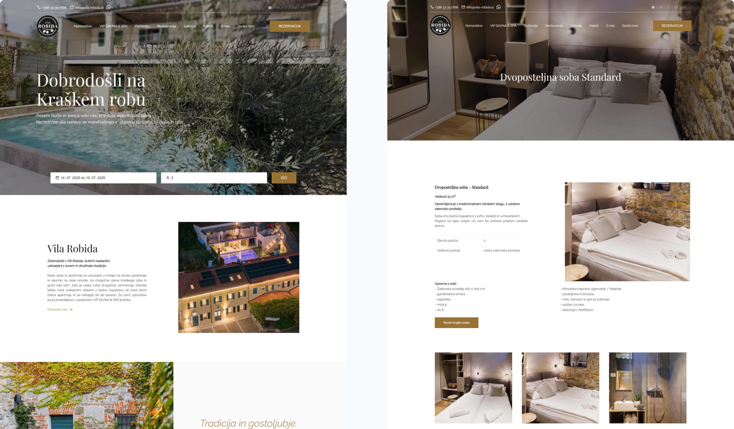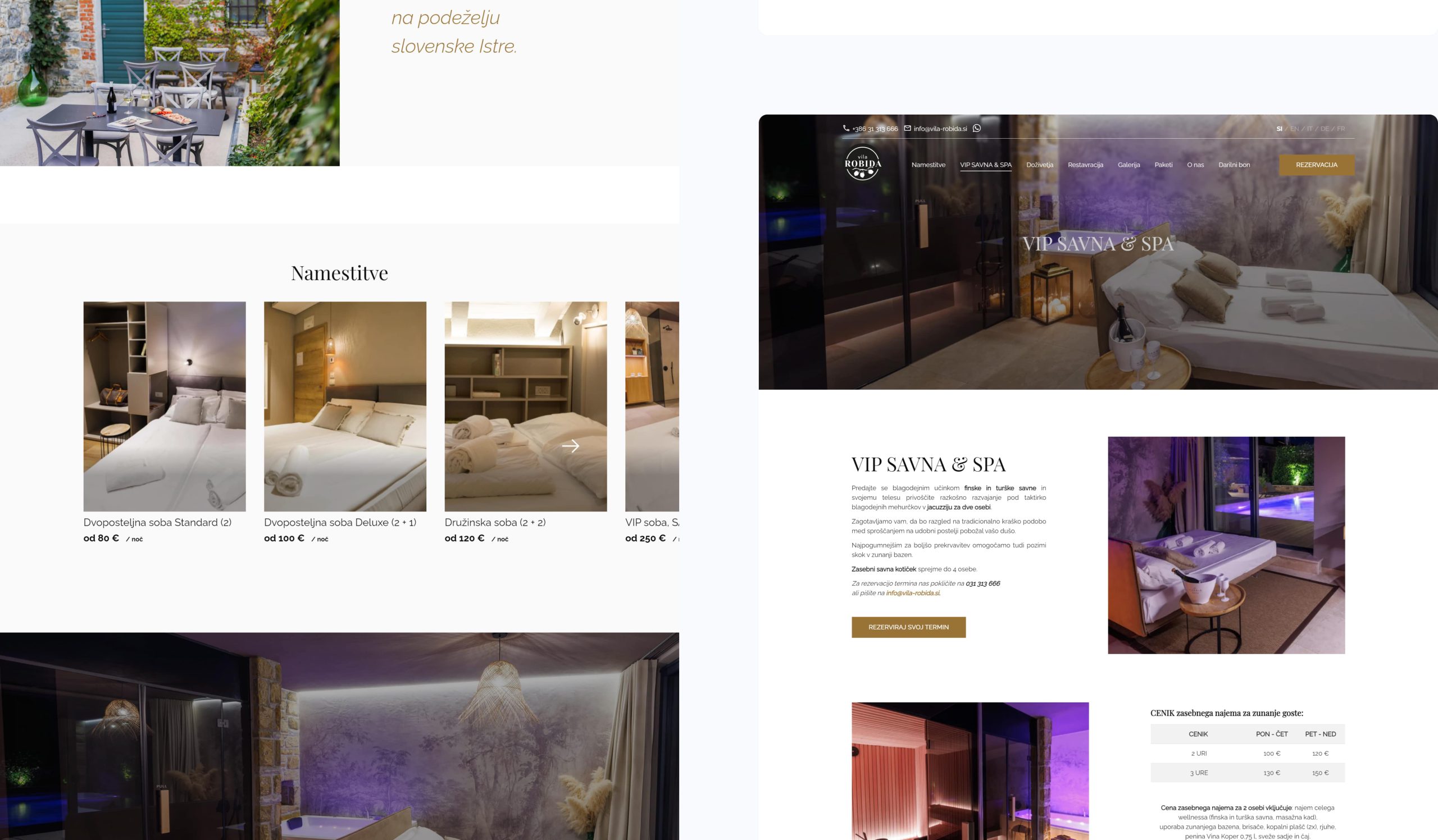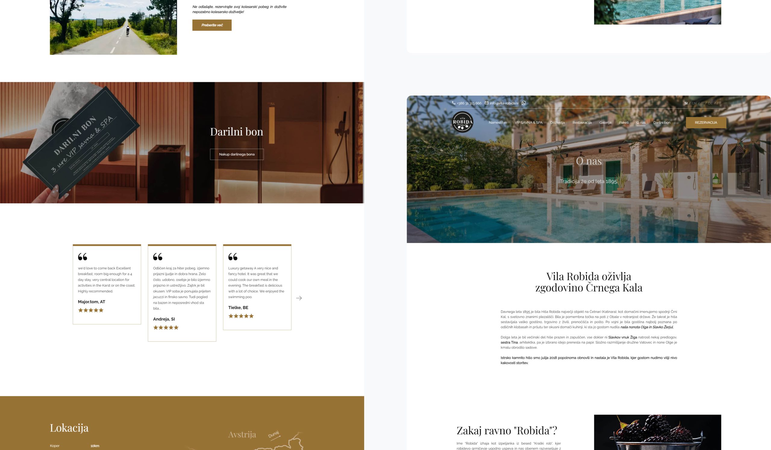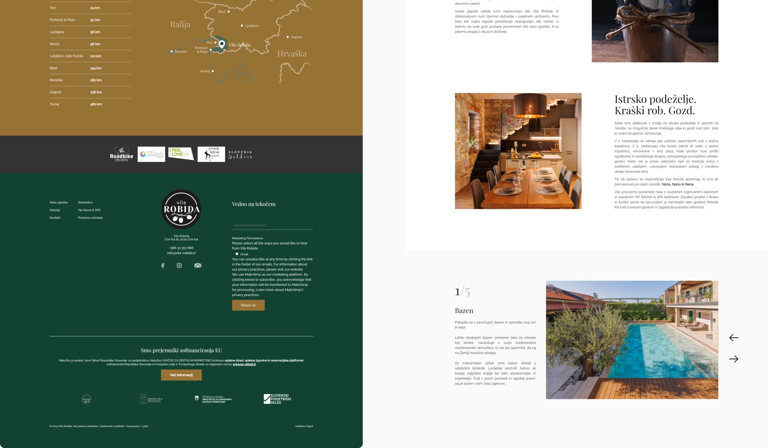 Iz poslanih fotografij in primerov dobrih praks sem oblikoval stran, ki z obiskovalci v največji meri komunicira s fotografijami. Zlato-zeleni elementi in preprosta, a elegantna tipografija so bili kot nalašč za občutek blagovne znamke Vila Robida.